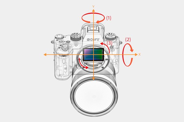 Wbudowany 5-osiowy stabilizator wydłuża czas otwarcia migawki o 5 jednostek. Stabilizowany monitor z podglądem na żywo pozwala komponować obrazy przy fotografowaniu będących w ruchu obiektów. (1) przechył g./d. (2) obrót - oś pion. (3) przechył l./p.